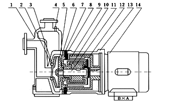 8.隔離層 | 9.外磁鋼總成 | 10.內(nèi)磁鋼總成 | 11.泵軸 | 12.軸套 | 13.聯(lián)接架 | 14.電機(jī) |